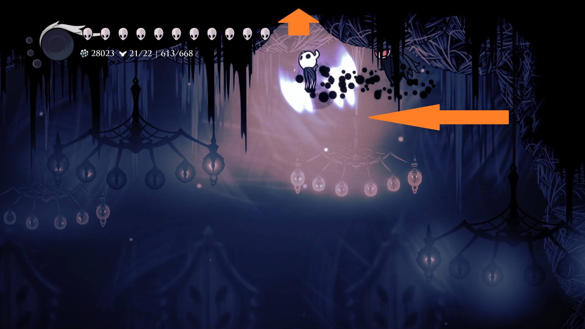 あらゆる場所(壁、床、水面…)でPOGO(下斬りをして跳ねること)が可能になります。 POGOを制するものはハロウネストを制す、とは言い過ぎかもしれませんが、重要テクニックを好きに行えるのは楽しいです。 ある程度のテクニックを要しますが、蛾の羽根の衣やカマキリの爪といった、重要アイテムの大半を無視してノーマルエンドを迎える、という遊び方が出来ますので、良かったらどうぞ…。 未確認ですが、村に行かずいきなり崖を登っていけば、復讐の魂も不要かもしれませんね。 参考画像より少ないアイテムでクリア出来そうです。なお、スポアシュルームのあるルームの酸だけ、上手く動作しませんでした。