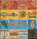 「外の世界の嫌なモノを見る(見つける)」といったところでしょうか。敵が出現するという実際の仕掛けからの推測です。 1つめは魚ですが、「嫌なもの」という意味もあるそうです。 バツ印のようなものは「町、市」、王冠のようなものは「砂漠、外国」といった意味のようです。